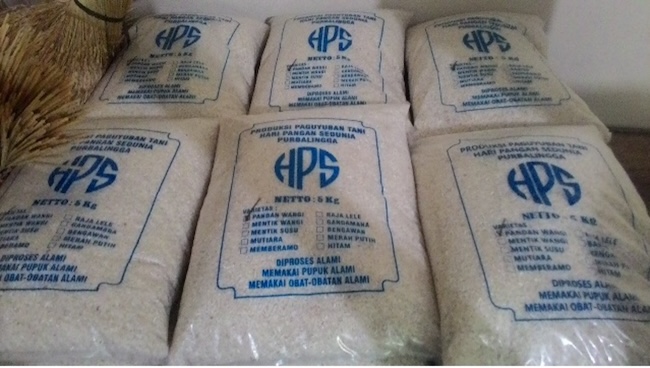 Beras organik produksi Mbah Gatot Surono dengan cap Hari Pangan Sedunia (HPS) dijual untuk turut mencukupi kebutuhan keluarga (Dok. Tim AOI, 2019)