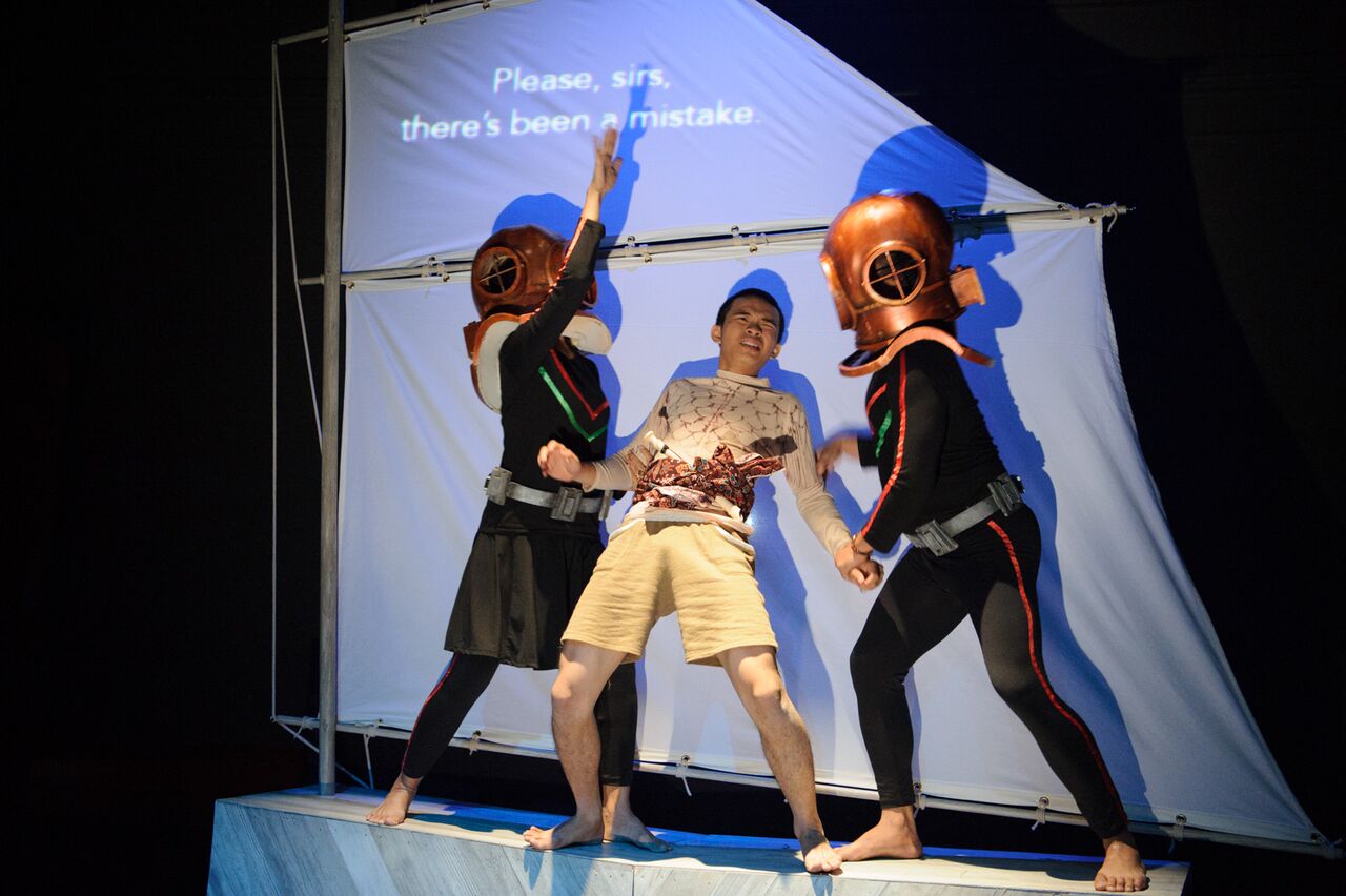 Ikan is captured by Australian officials. His story is told through a colourful mixture of imagery, shadow puppetry and live actor interaction. (Barbara Hatley) |