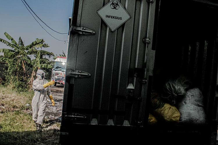 Banners, murals and signs have sprung up on city streets, creating a very public reminder of efforts to combat the spread of the virus. The pandemic has also left its mark on the urban landscape in other ways: the Wisma Atlet in Kemayoran, used for the Asian Games in 2018, has been turned into a make-shift hotel for COVID-19 patients in self-isolation. As Ahmad’s photos show, cemeteries too have been filled to overflowing with those who have died from the coronavirus. New cemeteries have had to be built; providing grim material evidence of the virus’s reach and in turn rendering statistics on infection numbers somewhat irrelevant.