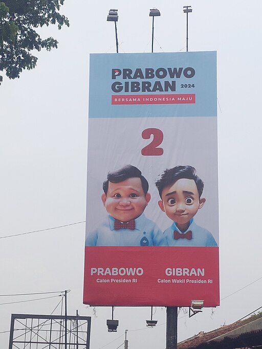 Presidential campaign banner of Prabowo-Gibran taken in Lenteng Agung, Jakarta (2023). Generated with AI to look like animated elementary school children characters / Kaliper, Public domain via Wikimedia Commons
