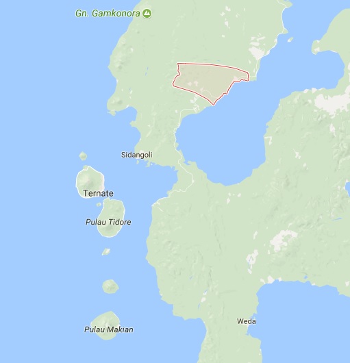 Makian Island (bottom left) and Malifut (area shaded in red). (Map data by Google) |